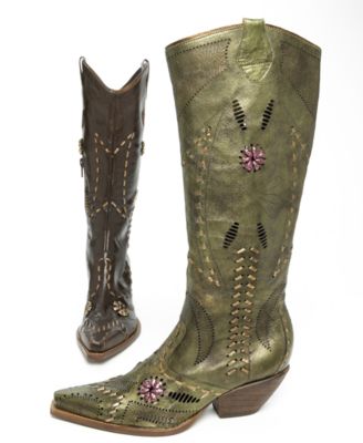 I am looking for cowboy boots - Black, decent size heel - but not too high...the most important part is the detailing...I would like the detailing to be all the way down on the toes so you can see it when I wear them with jeans. Maybe something colorful in the detail - or metallic? Oh I also want the leg part to be high enough to wear with skirts....